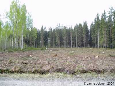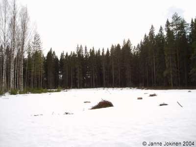 Mehiläistarhani paikka valtion (Metsähallituksen) mailla talvella ennen pesien saapumista. Ohjeiden mukaan tarhan paikan pitäisi olla mielellään etelään avautuva loiva rinne, minne aurinko paistaisi (etenkin keväällä) mahdollisimman esteettä. Oma paikkani on vähän varjoinen (kuva avautuu etelään) etenkin talvella, mutta parempaakaan en saanut käyttöön niillä rajauksilla, mitä itse ja aluetta hallinnoivat asettivat. Kesällä mitään ongelmia ei kuitenkaan tullut, toivotaan että keväälläkin lämpö riittää. Sama paikka toukokuussa juuri ennen pesien saapumista. |