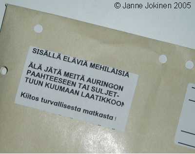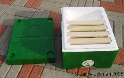"Köyhän miehen lämpökaappi" Linkosin ison osan hunajasta lämmittämättömässä tilassa vasta melko myöhään syksyllä. Tämän vuoksi tarvitsin jonkun virityksen hunajan lämmittämiseksi, eikä minulla ollut tilaa tai intoa rakentaa oikeaa termostaattisäätöistä lämpökaappia. Ratkaisu oli yksinkertainen: Tein puusta noin 10 cm korkean sokkelin, jossa oli auton sisätilanlämmittimen kokoinen aukko etulaidassa. Tämän sokkelin päälle kasasin yhden linkouserän verran hunajalaatikoita (n. 6 laatikkoa kerrallaan). Tornin päälle laitoin yhden vanerilevyn "eristeeksi", siten toki raolleen että ilmavirta kulki tornin yläosasta pois. Auton lämmityspuhaltimen laitoin puhaltamaan ilman lämmitystä (onneksi oli sellainen säätö), mutta toisen lämmityspuhaltimen laitoin puhaltamaan lämmintä ilmaa tornin sisälle puhaltavan laitteen lähelle. Yksi puhallin siis yksinkertaisesti teki jatkuvan ilmavirran hunajalaatikkotornin sisälle, toisella lämmitin ilmaa ensimmäisen ympäristöön. Lämpötilan säätö tapahtui siten, että tornin alla olevan sokkelin sisälle ututin pitkävartisen lämpömittarin, jonka lämpöä seurasin illan mittaan. Siirtämällä lämmintä ilmaa puhaltavan laitteen lähemmäksi tai kauemmaksi kylmäilmapuhaltimesta, pystyi lämpötilaa säätämään ihan kivasti. Kun säätö oli löytynyt, lämmitys sai olla päällä yön yli tai seuraavaan päivään. Tällä ratkaisulla laatikot pystyi helposti ja halvalla lämmittämään takaisin pesälämpöiseksi. Seuraavaa kesää varten olen hommannut jonkun lehden tutustumistarjouksena ylimääräisen "langattoman sääaseman", jonka pikkuisen etäluettavan lämpömittarin avulla lämpötilansäätö on aiempaakin helpompaa (=seuranta olohuoneesta käsin). Joskus voisi tietenkin askarrella yhden pesälaatikkotornin kokoisen kaapin jostain eristelevystä ja hommata siihen termostaattipuhaltimen. Emopesät Tarkoitus oli kokeilla emonkasvatusta kesällä 2005 toukansiirtoineen päivineen, mitä varten ostin täyden setin emonkasvatustarpeita ja emopesiä. Siihen aikaan kun emonkasvatusta olisi pitänyt aloitella, kotona oli kuitenkin muutaman viikon ikäinen vauva, elikkä homma jäi luonnollisista syistä odottamaan myöhempiä aikoja. Emopesästä oli kuitenkin muuta hyötyä: Emoja vaihtaessani olin välillä huolissani uusien emojen kelpaamisesta pesään, minkä vuoksi halusin jemmata vanhoja emoja kunnes emojen hyväksyntä oli varmaa. Laitoin emon emopesään ja mukaan desi-pari mehiläisiä, ja ruoaksi kaupallista Apifonda-sokeria. Hyvin homma toimi, kakustoa rakennettiin ja emo munikin. Loppukesästä tosin pesät joutuivat ryöstön uhriksi, kun olivat valitettavasti liian lähellä isoja pesiä. Kirjekuorimehiläiset Kokeilin ensimmäistä kertaa emojen tilaamista kirjekuoritoimituksena. Hyvin homma toimi: emot tulivat lähetystä seuraavana päivänä perille ja kelpasivat hyvin pesilleen. Hassu tuollainen pärisevä kirjekuori... Postin toimintaa täytyy kehua: vaikka kyseessä ei ollut mikään erikoiskirje, oli postinkantaja etsinyt puhelinnumeroni, soitti aamulla seitsemän jälkeen kotiin ja kysyi, haluanko tulla noutamaan mehiläiset heti talteen. Kun olin menossa töihin enkä olisi heti pesille päässyt ja toisaalta vaimo oli kotona ottamassa mehiläiset talteen heti postin saapuessa, käskin tuoda normaalisti laatikkoon. Postinkantaja ei kuitenkaan ollut jättänyt mehiläisiä laatikkoon, vaan toi kotiovelle saakka. Erinomaista palvelua! |