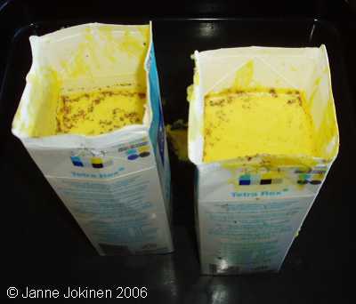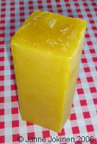 ![]() Sulan mehiläisvahan sai hyvin valettua litran maitotölkkiin. Vahassa olevat roskat erottuvat tiheytensä perusteella vahasta, ja kun valumuotin korkeus on mahdollisimman suuri pohja-alaan verrattuna, saadaan roskat eroteltua tehokkaimmin vahasta. |