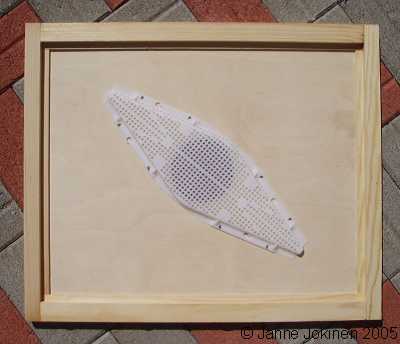 ![]() Valmis mehiläispakolevy, jonka rakensin em. korokekehästä, vanerilevystä ja mehiläispaosta. Mehiläispakolevy laitetaan 1-2 ylimmän kypsän hunajalaatikon alle kuvan puoli alaspäin, ja mehiläiset hakeutuvat muutamassa päivässä muiden seuraan alempiin laatikoihin eivätkä ne pääse takaisin. Mehiläispakolevyä käyttämällä hunajalaatikot eivät ole enää noudettaessa pesälämpöisiä, vaan ne pitää lämmittää ennen linkousta, jotta hunaja juoksee hyvin. ![]() Vielä jäi kehiteltävää sadonkorjuuseen. Tällaista jälkeä syntyy, kun parin hunajalaatikon mehiläiset pitää käsin ravistella ja harjata pois hunajakakuilta. |