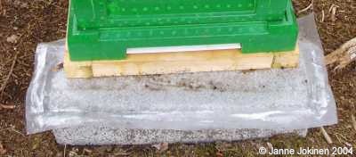 Vaikka mehiläiset osaavat puolustaa pesäänsä isompia häiriköitä kuten hoitajaansa vastaan, ne vaikuttavat ihmeen hölmöiltä pienempiä riesoja vastaan. Toisaalta puremiskilpailussa saattavat pienemmätkin muurahaiset pärjätä hyvin - joka tapauksessa kokeneemmat varoittavat, että muurahaiset voivat oikein innostuessaan tuhota mehiläispesän päivässä. Mehiläistarhani oli muurahaisia vilisevän metsän aukiolla, minkä vuoksi varauduin muurahaisia vastaan. Vakiokikka on rakentaa jalustan jokainen jalka siten, että rakenteen keskelle laitetaan alempaa osaa 5-10 cm joka suunnasta leveämpi rakennusmuovin pala, minkä pitäisi estää muurahaisia kiipeämästä ylöspäin. Muovi ei tientenkään saa notkua maahan saakka, eikä mikään heinä tai varpu saa ulottua maasta pesään tai muovin yläpuolisiin rakenteisiin. Tällaisen rakenteen toteutin, mutta eipä riittänyt... Pesät olivat olleet tarhassa yhdeksän päivää toukokuun lopussa, kun eräällä tarhakäynnillä muurahaisia kiipeili pitkin pesien seiniä, ja menivätpä lentoaukostakin sisälle vartijamehiläisten kiinnittämättä asiaan mitään huomiota! Edellisestä tarhakäynnistä oli kulunut neljä päivää ja toisaalta muurahaismäärä ei ollut (vielä) kovinkaan suuri, joten vahinkoa ei varmaankaan ollut vielä tapahtunut. Muurahaiset olivat jostain syystä keksineet hakeutua pesiin, ja olivat oppineet pyöräyttämään vartalonsa muovin reunan ympäri - mitään ongelmia niillä ei tietenkään ollut kävellä muovin alapinnalla. Paniikki meinasi iskeä, mutta onneksi keksin vielä samana iltana ratkaisun. Sattui perheen kuivaihoisen jäämistöstä löytymään parin kilon pönikkä vanhentunutta hajutonta ihorasvaa, mitä sivelin muovin alapintaan ja ajattelin, että siitähän möhnästä eivät muurahaiset kävele läpi. Teoria toimi ihan hyvin, eivätkä muurahaiset aiheuttaneet myöhemminkään kesällä ongelmia, edes sen jälkeen kun alkuperäinen rasvaus oli kuivunut kovaksi. Nyt rasvavarastot ovat kuitenkin lopussa, eikä minulla ole hyvää ideaa ensi kesän varalle. Apteekista ei viitsi ostaa rasvoja tuohon käyttöön, ja muita sopivia hajuttomia, halpoja ja riittävän rasvaisia (kestävät kuivumatta pitkään) en ole vielä keksinyt. Kokeeksi sivelin kesällä myös huoltoasemalla myytävää vaseliinia, mutta sen lemu oli niin hirveä ohuenakin kerroksena, että pelkäsin sen jopa häiritsevän mehiläisiä tai tarttuvan hunajaan ja poistin rasvan. Monimutkaisempiakin viritelmiä ovat toki muut kehitelleet. Eräs ratkaisu on rakentaa jalustaan öljyä täynnä oleva pikkuämpäri, minkä keskeltä ylemmän osan jalka nousee. Myrkkyjä ei tietenkään mehiläispesien lähellä uskalla käyttää. Ja hyödyksihän nuo muurahaiset maassa ovat, kun poistavat pesistä verkkopohjan läpi tippuvat ja mehiläisten ulos heittämät roskat ja raadot. |