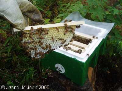 ![]() Hyvänä satokesänä pesät täyttyivät osin tukkeutumiseen saakka medestä, mikä johti parveiluintoon ja kuvan emokennojen rakenteluun. ![]() Pesän kasvattama ja vapaasti pariutunut emo siepattuna kakulta emon kiinniottopiipulta. Kokeilin tällaisen piipun käyttöä, koska vieläkin arastelin mehiläisten käsittelyä paljain käsin - osin tämä tosin oli tietoista pistosten ja mahdollisen allergisoitumisen välttämistä. Kesällä 2005 piikkejä tuli kylläkin niin paljon, että loppukesästä ne eivät enää juurikaan haitanneet... |