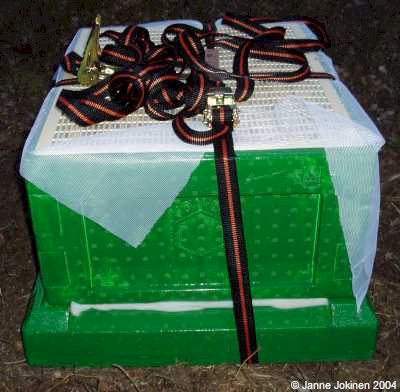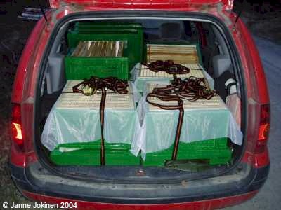 ![]() Mehiläispesä pakattuna siirtokuntoon. Pesä tuulettuu verkkopohjan ja katon paikalle laitetun hyttysverkon ja sulkuristikon kautta - hyvä tuuletus on välttämätöntä, etteivät mehiläiset päristä pesää niin kuumaksi että vahakennosto sulaisi. Lentoaukko on suljettu vaahtomuovisuikaleella ja koko hoito paketoitu kuormaremmeillä. ![]() Kolmen pesän ja muutaman laatikollisen tyhjiä kakkuja siirtäminen onnistuu ihan näppärästi farmariautossa. Mehiläisiä toki jää pörräämään autoon seuraavaksikin päiväksi, kun tulevat autoon pesien mukana ja kevätiltana eivät kohmeisina anna itsestään merkkiä. |
