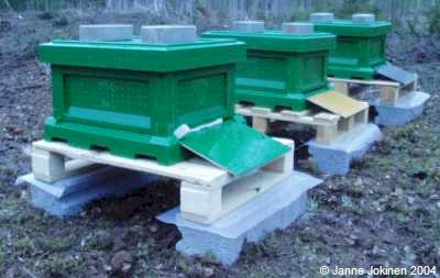 Jälkitoimet omalla tarhalla Uusien pesien jalustat oli kannattanut valmistella valmiiksi odottamaan jo ennen pesien noutoa. Pesät nostin jalustojen päälle ja poistin kuormaremmit, mutta jätin hyttysverkon ja sulkuristikon paikoilleen, ainoastaan taittelin verkon liepeet pesän katon alle. Näin mehiläisiä häirittiin mahdollisimman vähän stressaavan matkan jälkeen - lisäksi ne eivät olleet vielä tehneet suunnistuslentoaan uudella pesäpaikalla, eivätkä olisi välttämättä laumoina ilmaan pörähtäessään löytäneet takaisin pesään. Kun tilanne rauhoittui, pesien lentoaukkojen vaahtomuovisuojat pystyi poistamaan, eivätkä mehiläiset halunneet enää lähteä illalla lentelemään. Mitä nyt kurkkivat normaalisti ja ryhtyivät vartioimaan lentoaukkoa. Jaoke oli kuitenkin muita heikompi pesä eikä sillä välttämättä olisi riittänyt vartijoita koko lentoaukon pituudelle, minkä vuoksi se olisi saattanut joutua muiden pesien ryöstelyn uhriksi. Toisaalta yhdyskunta kattoi ainoastaan puolet pesälaatikon tilavuudesta, loppu oli styroxilla erotettu tyhjäksi tilaksi. Näiden syiden vuoksi jätin vaahtomuovin vielä muutamaksi viikoksi heikoimman pesän lentoaukkoon, tein ainoastaan kapean reiän, mistä mehiläiset pääsivät sisään ja ulos. Näiden toimien jälkeen pesät pystyikin jättämään rauhassa paikoilleen, odottamaan seuraavaa päivää ja uuteen alueeseen tutustumista. Muutaman päivän kuluttua ensimmäisellä pesäkäynnillä poistin hyttysverkot, sulkuristikot ja kehien vaahtomuovituet. Aloitin lisäksi jaokkeen ruokinnan 50%:n sokeriliuoksella ruokintakehässä... pienellä jaokkeella oli talviruoka jo vähissä ja porukkaa vähän keräämässä mettä, minkä vuoksi pesien myyjä suositteli rauhallista ruokintaa puolen litran - litran erissä jopa juhannukseen saakka... silloin ei vielä arvannut, että kesäkuusta tulee hyvin sateinen ja kylmä, ja vahvimpiakin pesiä joutui (ainakin aloittelija hermostuksissaan) ruokkimaan. Kokonaisuutena pesien siirto oli hyvin yksinkertainen operaatio, ilman sen suurempia riskejä. |