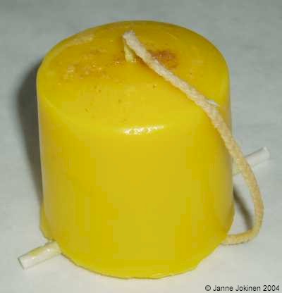 ![]() Vaha sulaa näppärästi vesihauteessa, leimahtamisvaaran vuoksi sitä ei saa lämmittää suoraan liedellä. ![]() Vahaa menossa kynttilämuottiin. Tämä oli vain ensimmäisiä kokeiluja eikä vahaa oltu puhdistettu kunnolla, minkä vuoksi roskia siivilöitiin vielä tässä vaiheessa. Jatkokehittelyn tärkein puoli tulee olemaan vahan puhdistus. ![]() Valmis kynttilä ensimmäisistä kokeiluista. Hiukan tuli vielä roskaiseksi, mutta kuten edellä sanottiin, homma siirtyy jatkokehittelyyn. |